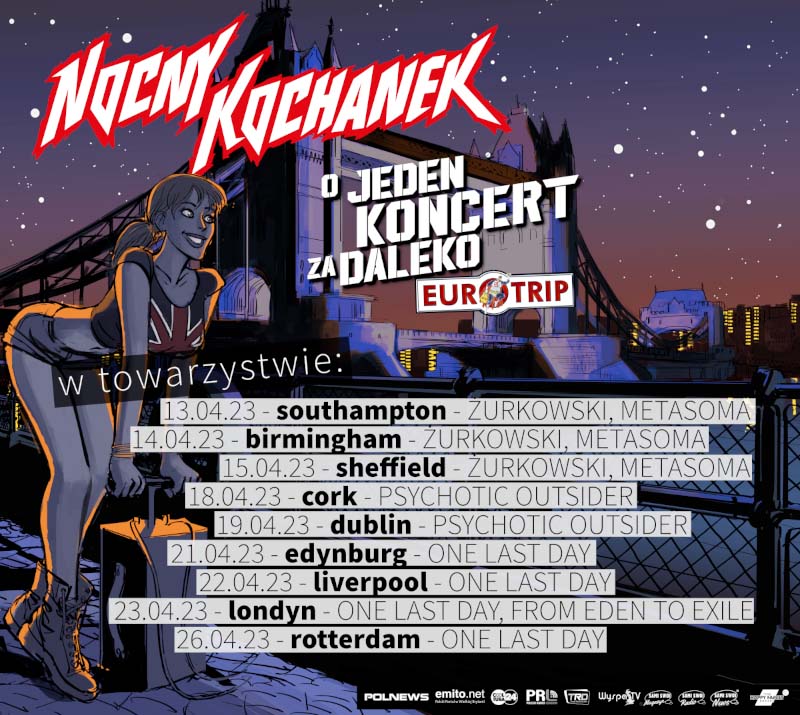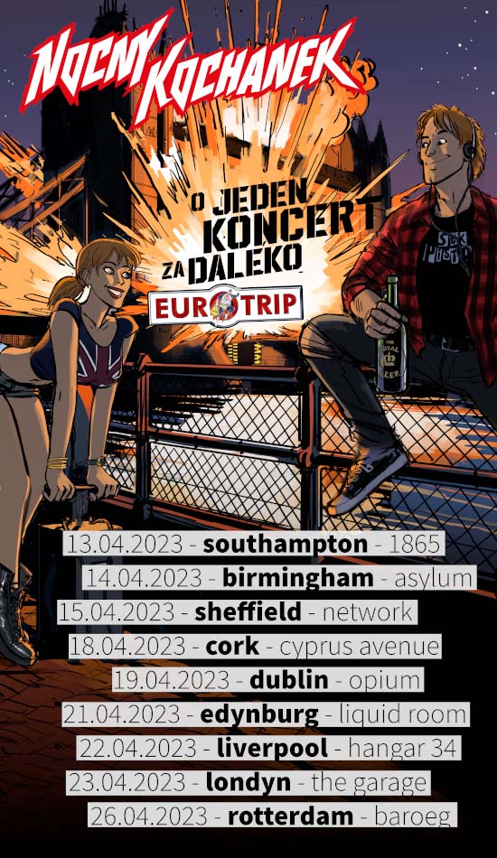Nocny Kochanek is not slowing down, and soon after a series of outdoor concerts, they will launch the European version of "O JEDEN KONCERT ZA DALEKO - EUROTRIP", promoting the album "O Jeden Most Za Daleko", which was released on September 23, 2022, with the support of Mystic Production. This time, the band will start their musical journey in Southampton, England. Then they will visit Birmingham, Sheffield, Cork, Dublin, Edinburgh, Liverpool, Manchester, and London, before ending their tour outside the country in Rotterdam, Netherlands. Nocny Kochanek will play a total of 9 concerts for the Polish community in Great Britain, Ireland, and the Netherlands, which will be the band's longest foreign concert tour to date since the memorable concert tour promoting the album "Randka w Ciemność" in September 2019. In the meantime, Nocny Kochanek didn't stand idle. After the outbreak of war in Ukraine, the band decided to donate part of the proceeds from their concerts to humanitarian aid for the country. The musicians played a special, intimate "Almost Cultural Tour" in small theaters, wanting to reach places that are usually overlooked in the plans of most well-known bands.