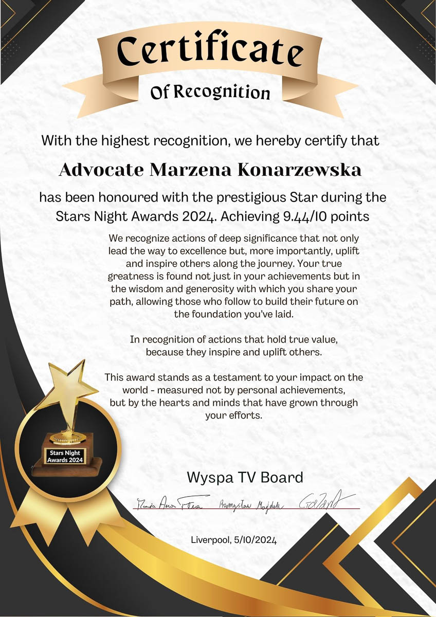 Advocate Marzena Konarzewska is a distinguished figure whose commitment and activities on behalf of the Polish community in the United Kingdom deserve special recognition. Her nomination for the Stars Night 2024 award is a testament to her enduring passion and countless hours of work dedicated to helping others.