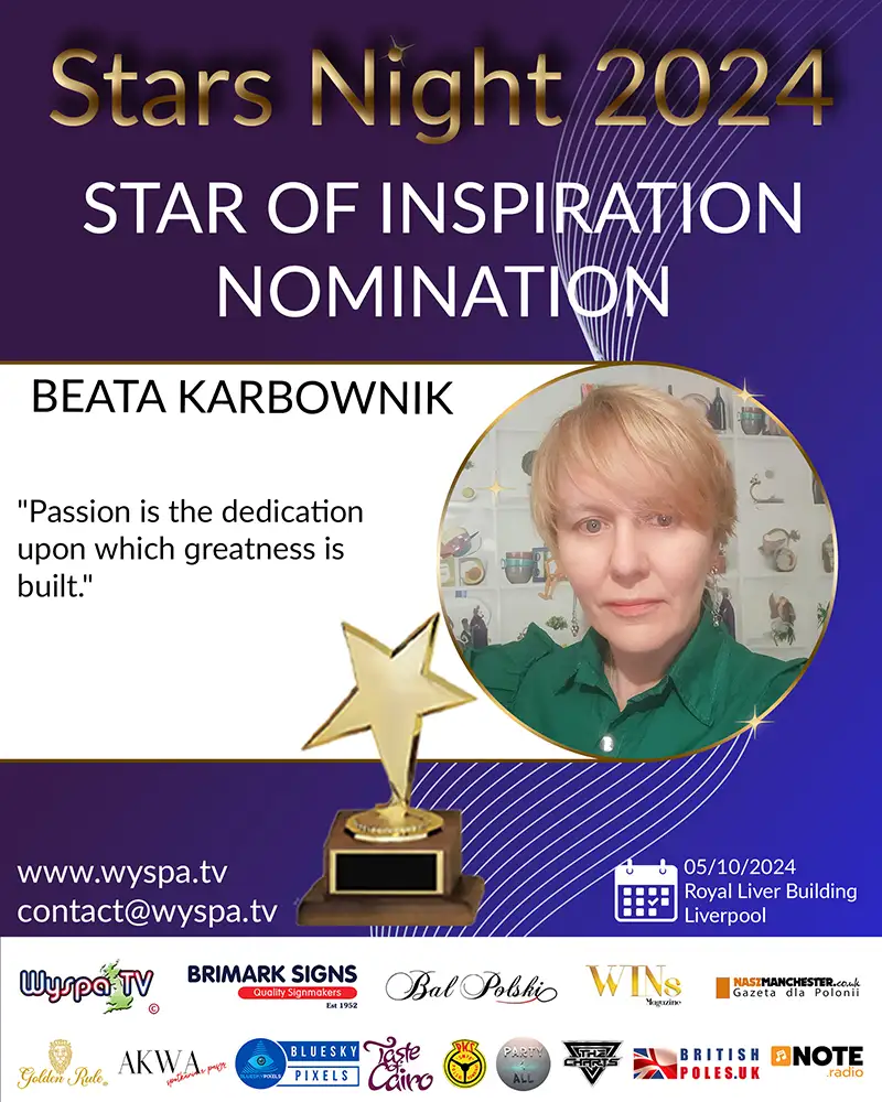 Beata Karbownik is an extraordinary woman, often called the godmother of Polish literature in emigration. She has gained recognition through her unwavering determination to raise awareness about Polish authors and their works beyond the country's borders. Her passion and commitment to promoting Polish literature in emigration have earned her a nomination for the prestigious Stars Night 2024 award in the Star of Inspiration category.
